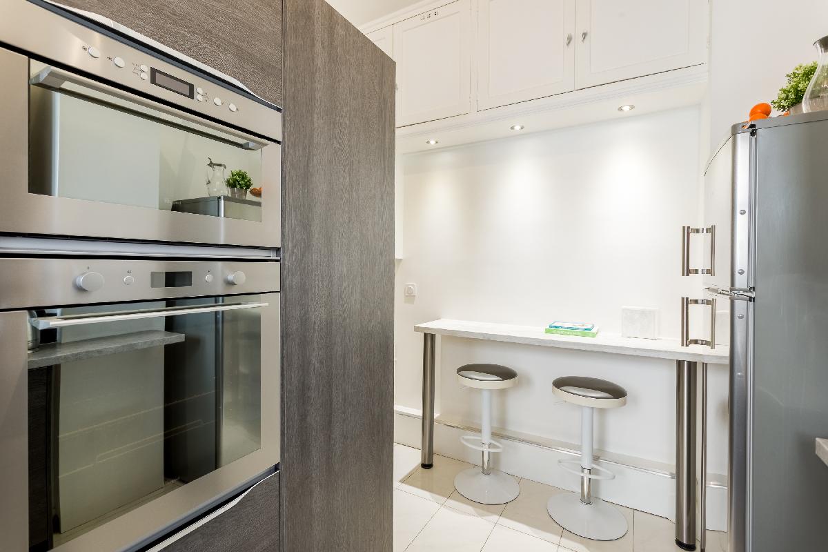 Newly renovated and decorated with stylish modern and antique furniture, this lovely abode is very welcoming and makes you feel like a true Parisian. The living room has a long L-shaped sofa that can sit six people including a 65 inch LED TV which has basic English channels (CNN, BBC, etc). The opening dining room has an antique wooden table that can sit up to six. The kitchen is fully equipped with a dishwasher, induction stove, brand new washer and dryer just to name a few.