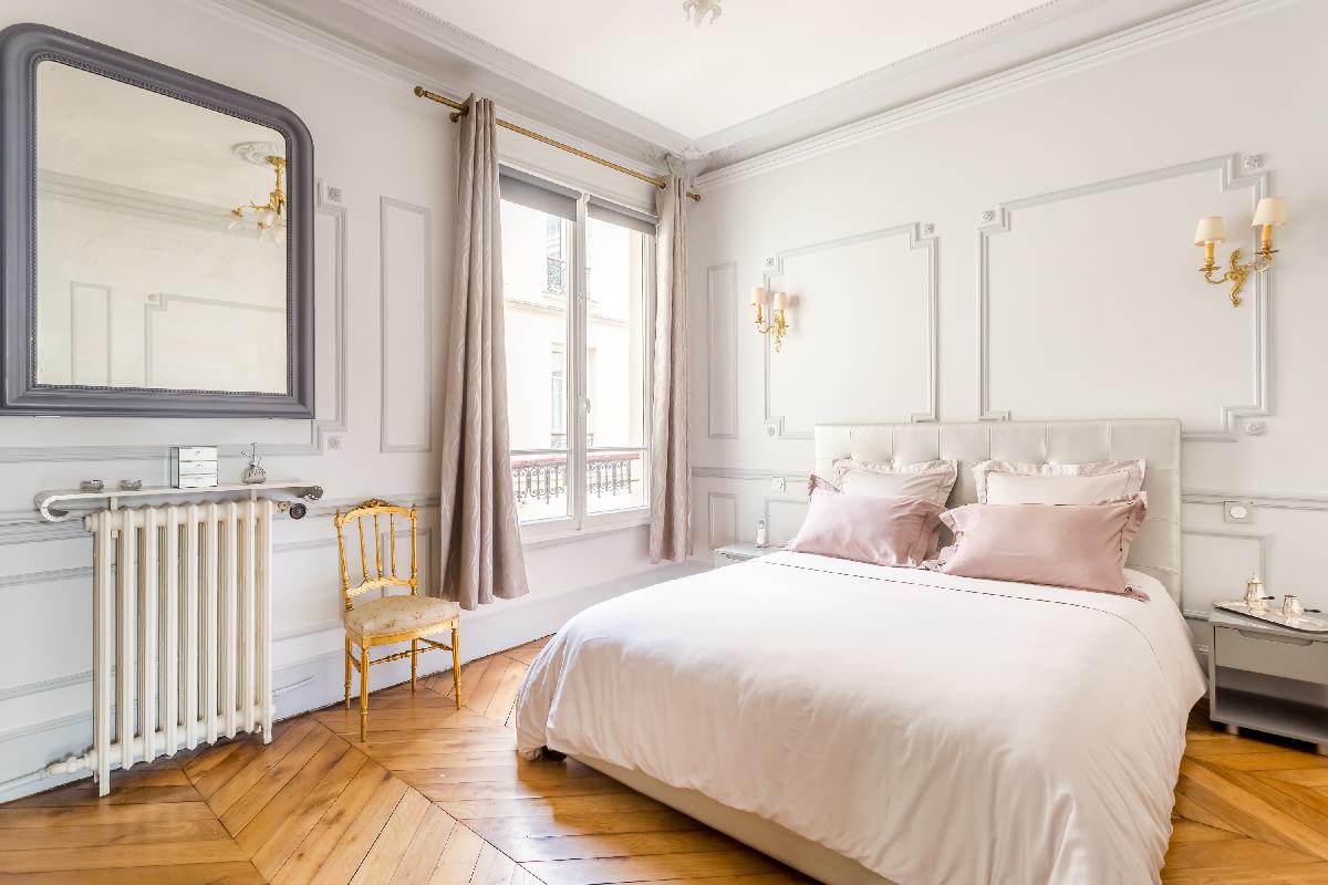 This spacious 175m2 three-bedroom, one-bathroom apartment couldn't be more Parisian with it's Haussmann architecture, high ornate ceilings, two marble fireplaces, a long balcony, large renaissance style original mirrors and original wooden floors. This property is for long-term rentals that can accommodate up to six guests.