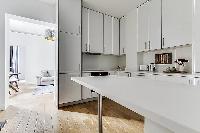 Next, there is a clean and white kitchen where you can make everything from a simple breakfast to a nice Parisian dinner for four.