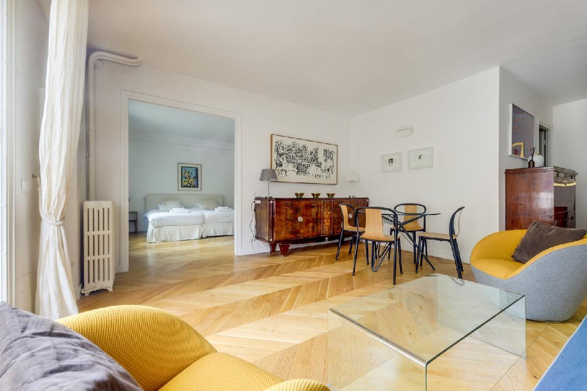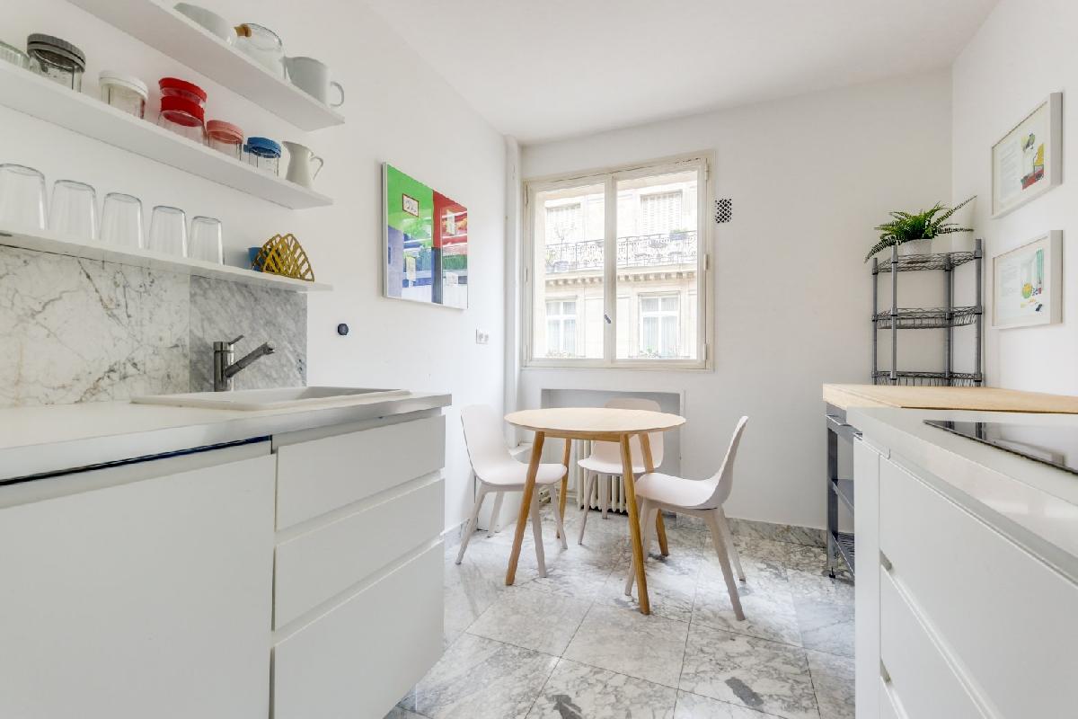 The apartment is well-stocked and modern. Upon entrance, the spacious living-dining area will welcome you. You’ll find a sofa, armchair, furniture and fixtures, typical beautiful hardwood parquet flooring of Paris homes, and large French glass windows that open to the balcony overlooking the street and the neighborhood which is perfect for your morning coffee or an evening aperitif. The round dining table can easily seat 4 people.