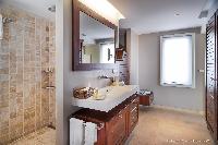 All bedrooms in this classic luxury villa have en suite baths that are well-lit and roomy, furnished with large vanities, walk-in showers, and supplied with toiletries.