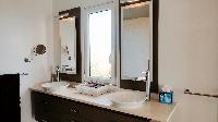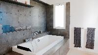 This luxury villa's three bedrooms will make you feel right at home with its soft, snug beddings and comfortable additions. Each bedroom has its own en-suite, grey-and-white bathroom and open into a private terrace with an ocean view. Two of the bedrooms are connected.