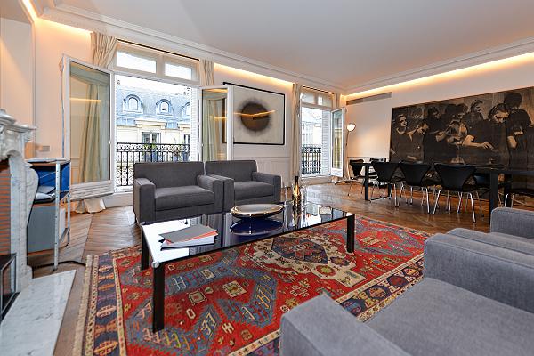 Housed in the 5th floor of an amazingly-maintained building with an elevator in the posh 8th district, this spacious apartment features 3 large bedrooms that can comfortably accommodate a large party. The interior is distinctly elegant and features furniture and furnishings that give the apartment a truly luxurious feel. Spanning a floor area of 200 square-meters, guests staying at this luxury Paris apartment rental will always have ample room.